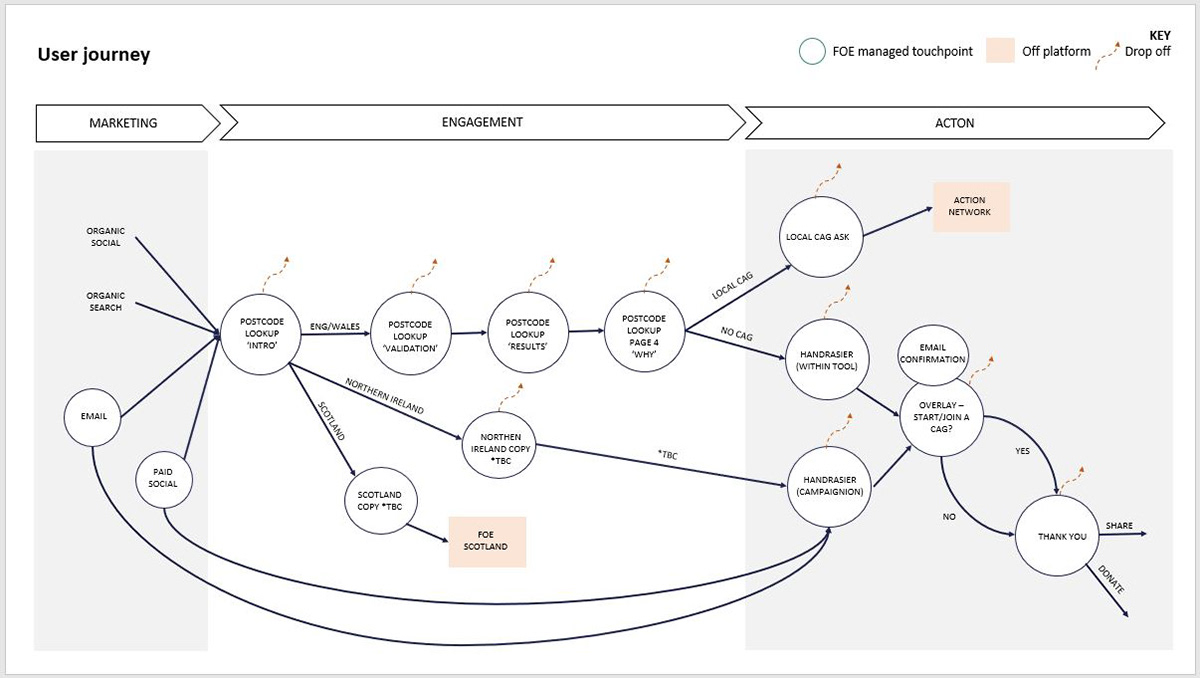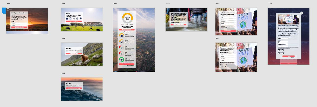 User journeys helped visualise the series of steps a user may take. They help the project team analyse if there were any parts of the process that can be consolidated (in this case the 'validation' and 'why' screen were cut from the final design). User journeys were also used in this project to ensure that measurement and analysis occurred at each touchpoint to assess the success of the climate action tool.