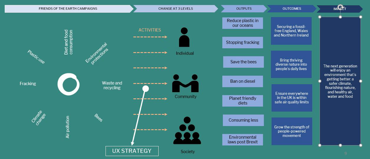 The final UX strategy acts as an enabler to connect individuals, communities and societies to the Friends of the Earth campaigns. This is done through improving the overall experience of the users when they interact with the charity and allows the Friends of the earth to define supporter experiences that are most conductive to the organisational mission.